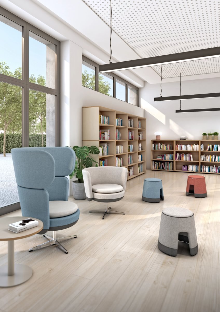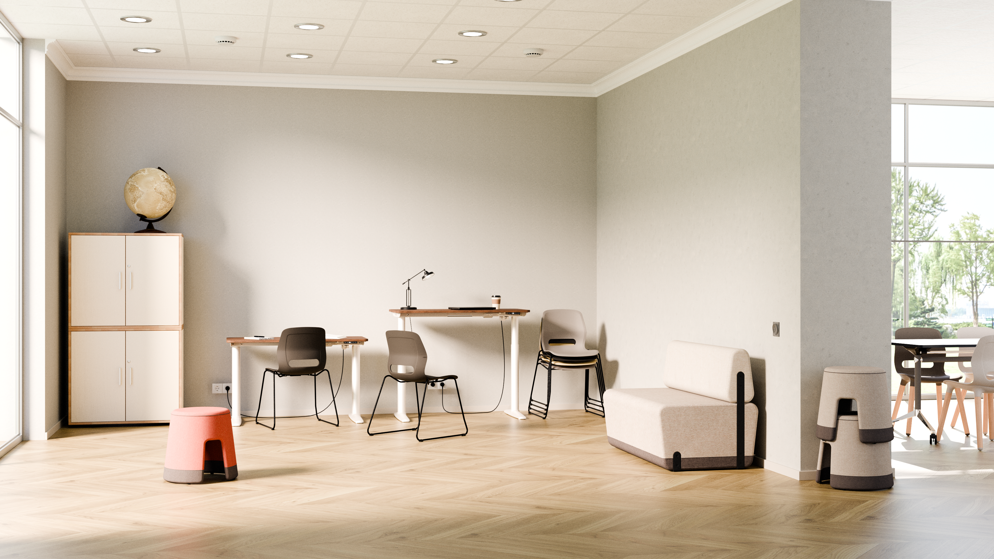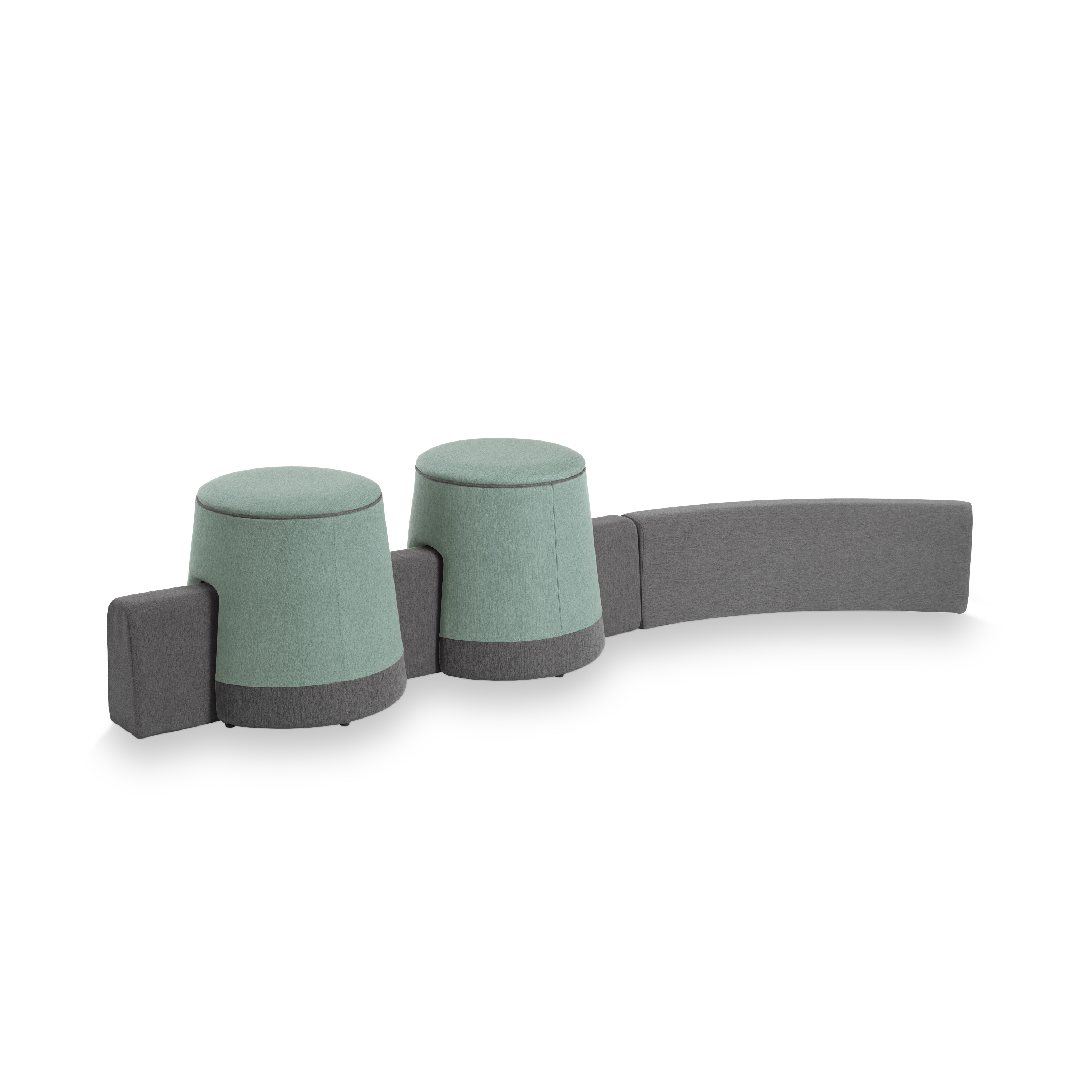 Modularer, gepolsterter Schulhocker, entworfen zur Schaffung von Ruhe- und Begegnungszonen in Bildungseinrichtungen. Ideal für das Klassenzimmer der Zukunft, Empfangsbereiche, Universitäten oder Bibliotheken.