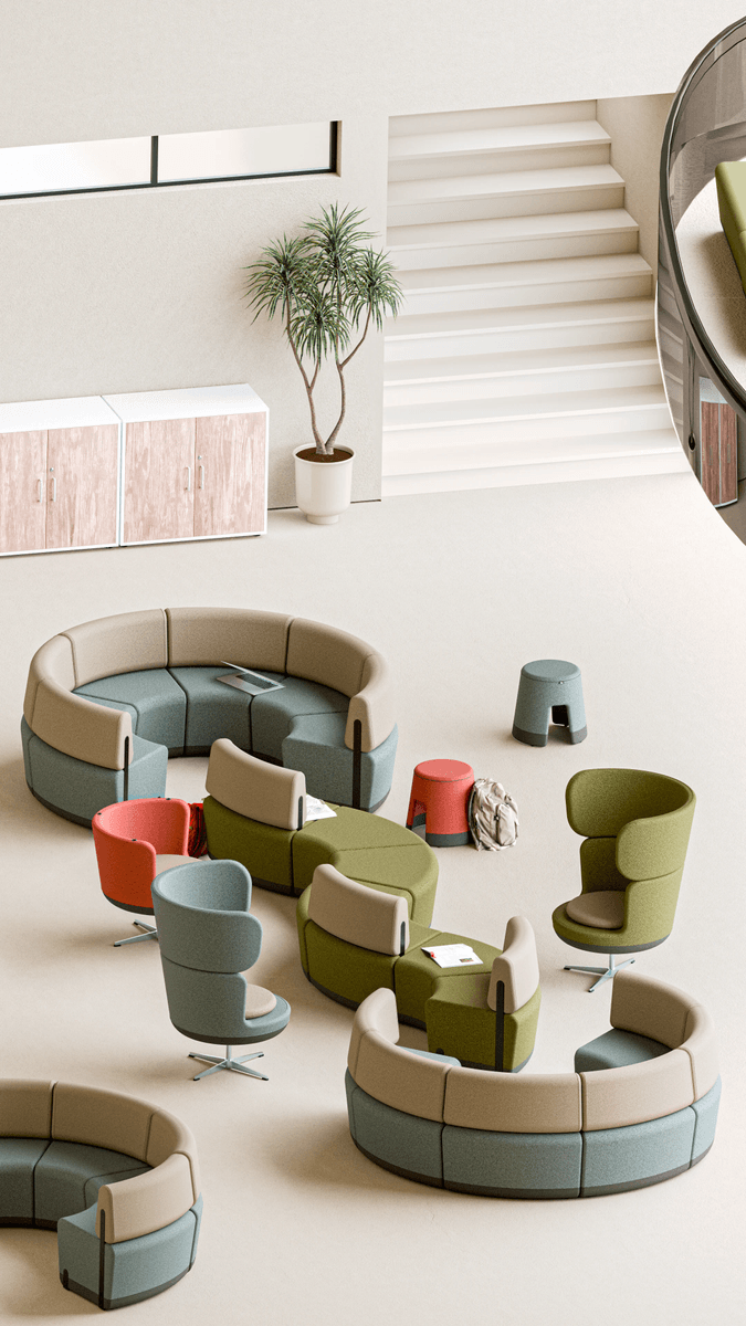 Modulares, rechteckiges Schulsofa ohne Rückenlehne, entworfen zur Schaffung von Ruhe- und Begegnungszonen in Bildungseinrichtungen.